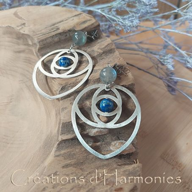La paire de boucle d'oreilles Petits Cœurs Harmonie Protection et Confiance en soi, une de mes "Créations d'Harmonies" vous harmonise, vous donne confiance en vous et vous protège. La forme de la divine proportion alliée à la lapis lazuli et à labradorite, pierre de protection des thérapeutes vous apporte harmonie, protection, force de régénération, confiance en soi et meilleure communication.