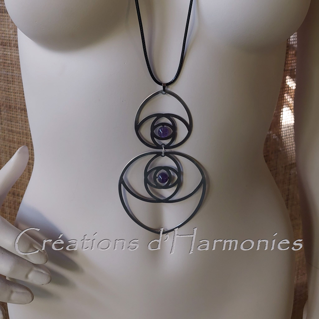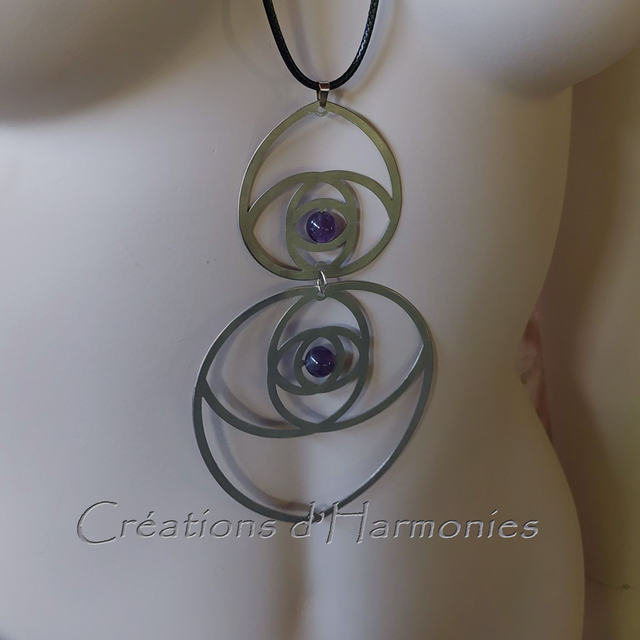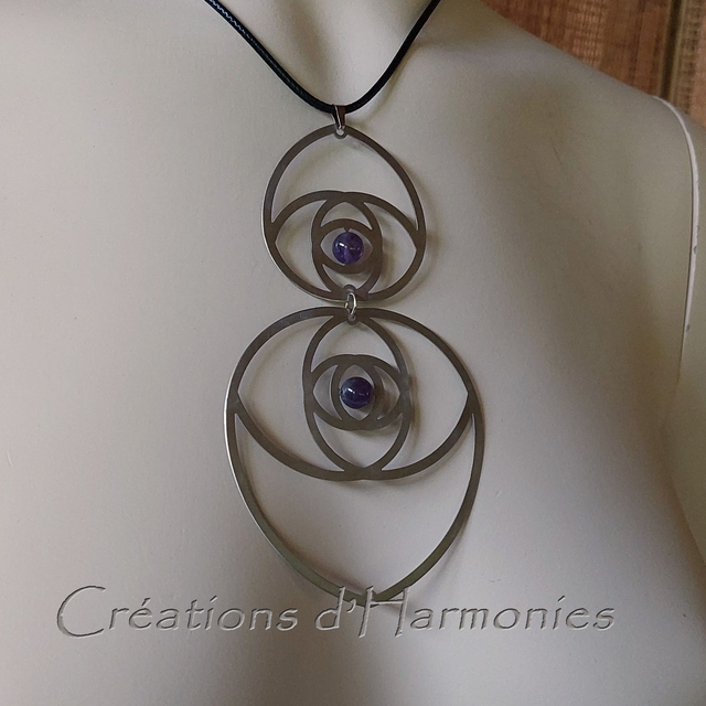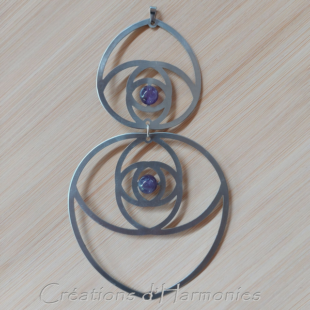 Le Duo apaise harmonise est une Création d'Harmonies qui vous harmonise. La synergie de la forme naturelle de la divine proportion avec les vertu de l'améthyste crée une bulle d'harmonie propice à l'apaisement.